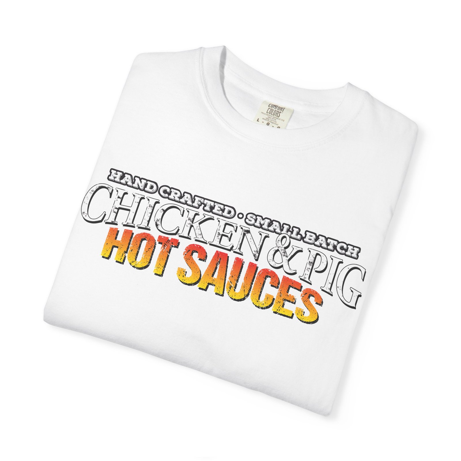 This relaxed, garment-dyed tee wears like something you’ve had for years — soft, a little lived-in, and quietly confident. The front graphic reads ā€œHAND-CRAFTED • SMALL BATCH CHICKEN & PIG HOT SAUCESā€ with a warm, smoky palette that hints at late-night backyard grills and small-batch kitchen experiments. Lightweight but substantial, the heavyweight cotton holds the print’s texture while the garment-dye gives each shirt a subtle, vintage depth. Throw it on for a weekend cookout, a roadside food-festival shift, or when you’re bottling up your latest hot sauce batch and want something comfortable that still feels like part of the craft. The relaxed fit and durable double-needle stitching mean this tee will be the one you reach for again and again.